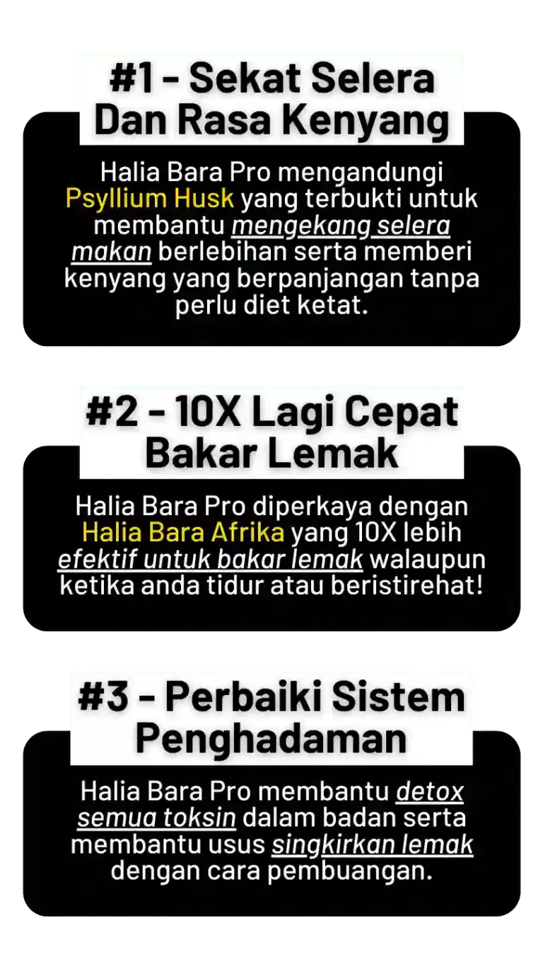 Halia Bara Pro bertindak dengan menyekat selera makan, membakar dan mencairkan lemak degil serta melawaskan pembuangan.