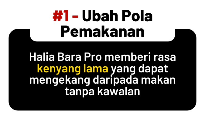 Halia Bara Pro bertindak dengan menyekat selera makan, membakar dan mencairkan lemak degil serta melawaskan pembuangan.