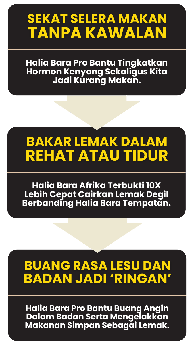 Halia Bara Pro bertindak dengan menyekat selera makan, membakar dan mencairkan lemak degil serta melawaskan pembuangan.